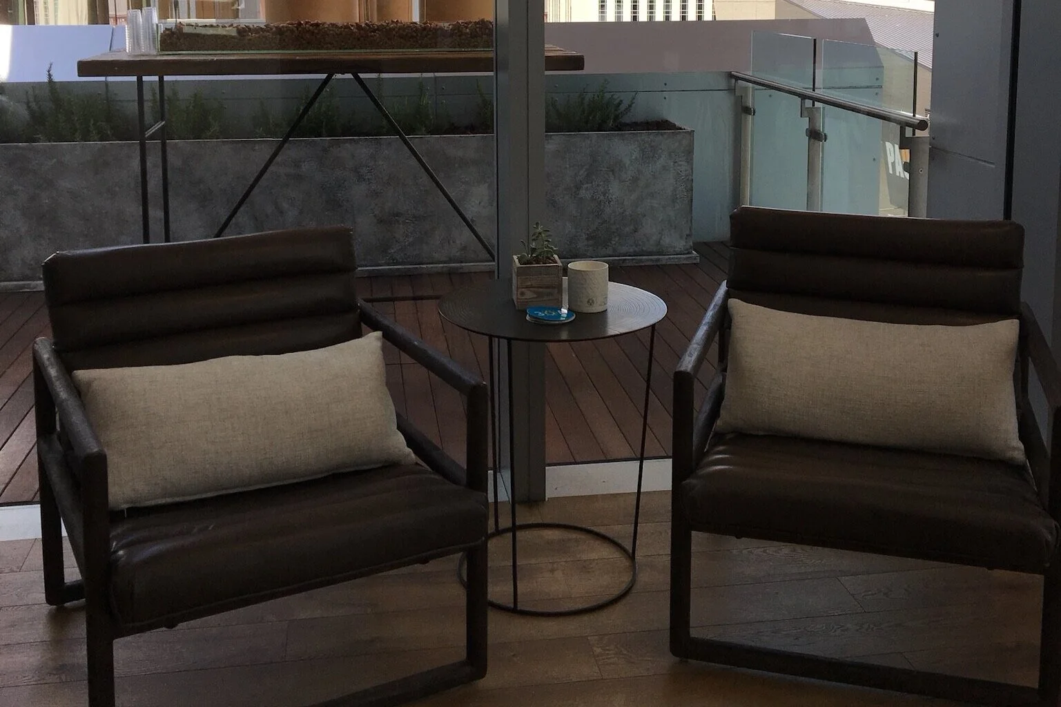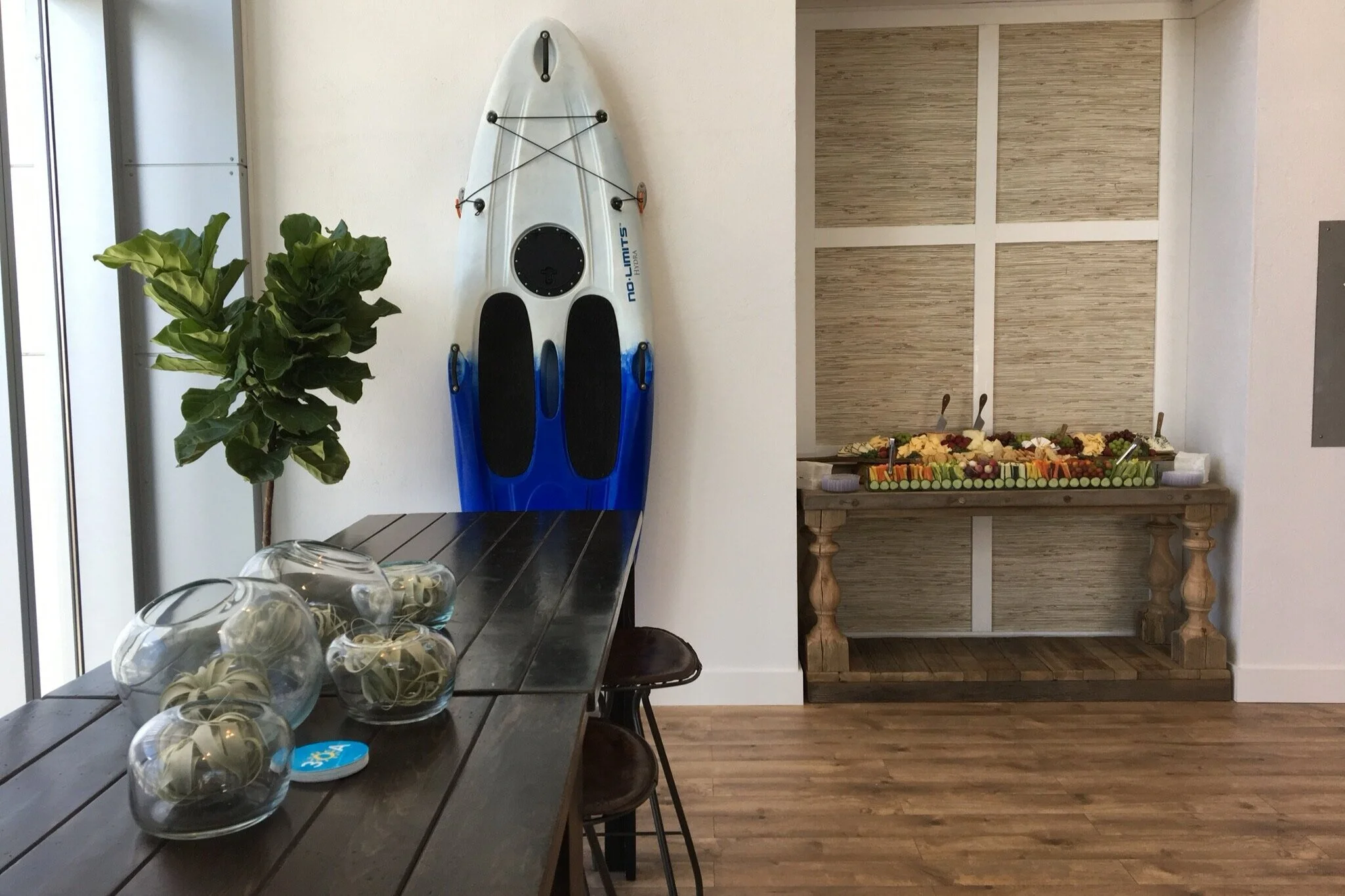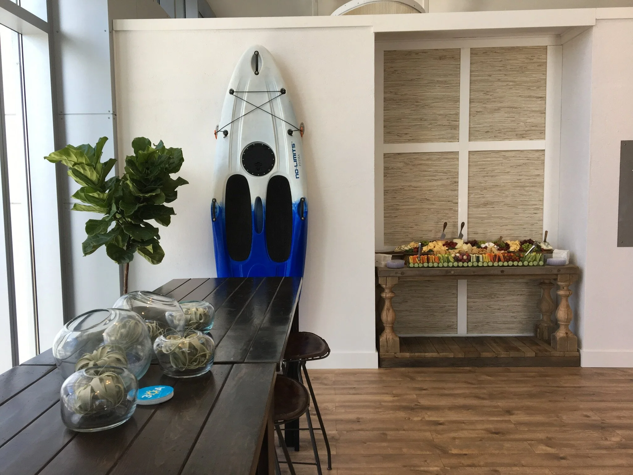 Built and custom fabricated a floor to ceiling plaster wall, built in hospitality area, beach wood catering table, and a cozy lounge and bar area for special guests to enjoy (all within 24 hours)